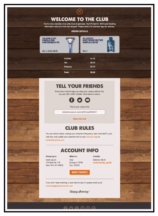 Tip – Like Dollar Shave Club, your confirmation email could feature the products the customer just bought with its image, the customer’s address, the option to make changes, and the expected delivery dates.